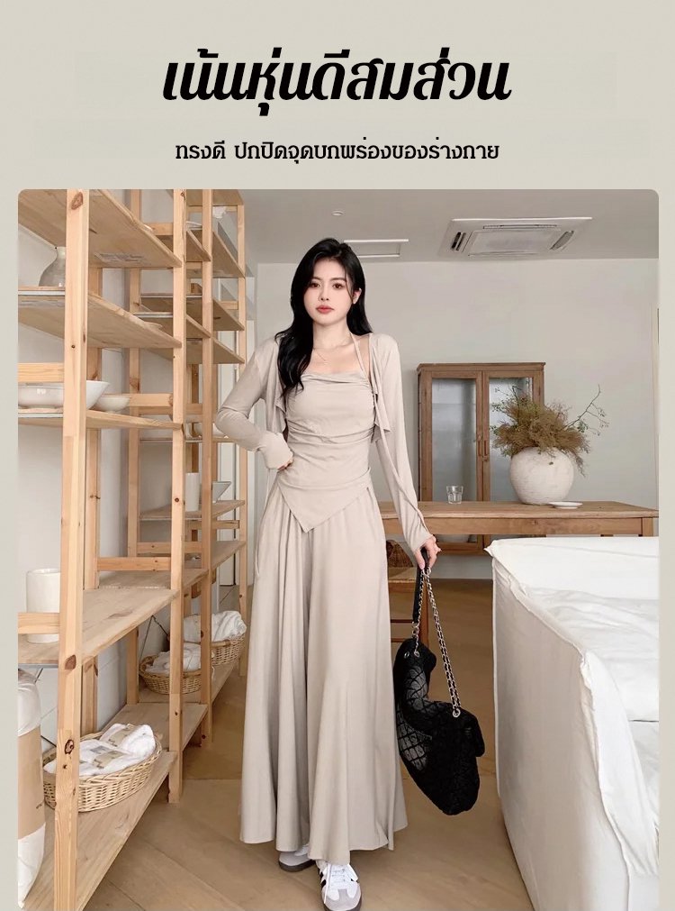 ชุดเซ็ทคาร์ดิแกนเสื้อสายเดี่ยว ชายเสื้อไม่สม่ำเสมอ ชุด 3 ชิ้น ดูผอม สำหรับผู้หญิง